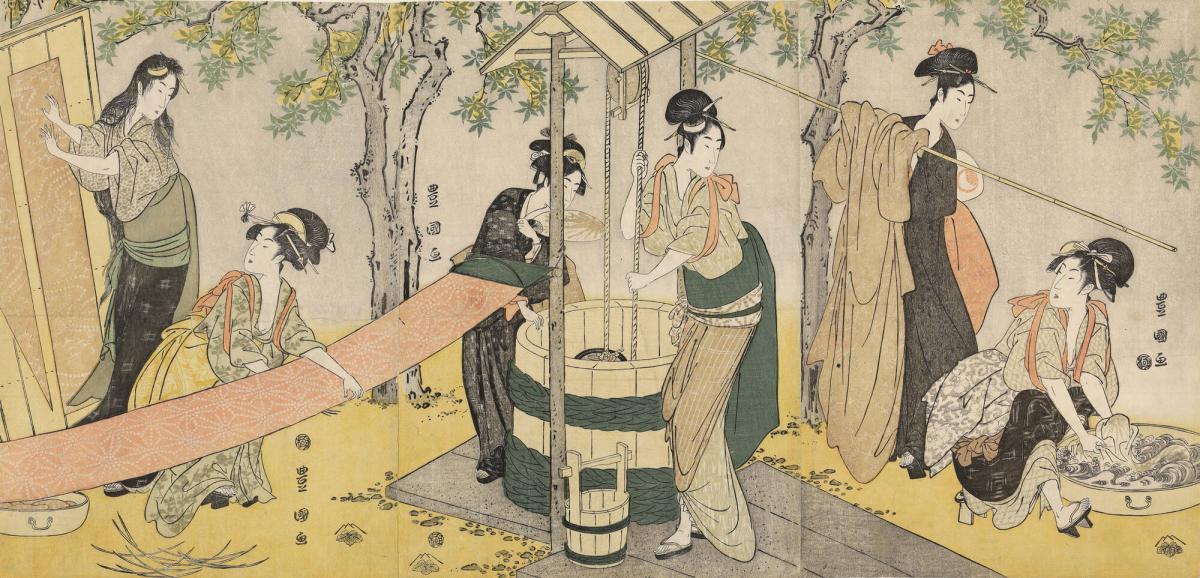 Women Washing and Stretching Lengths of Cloth beside a Well