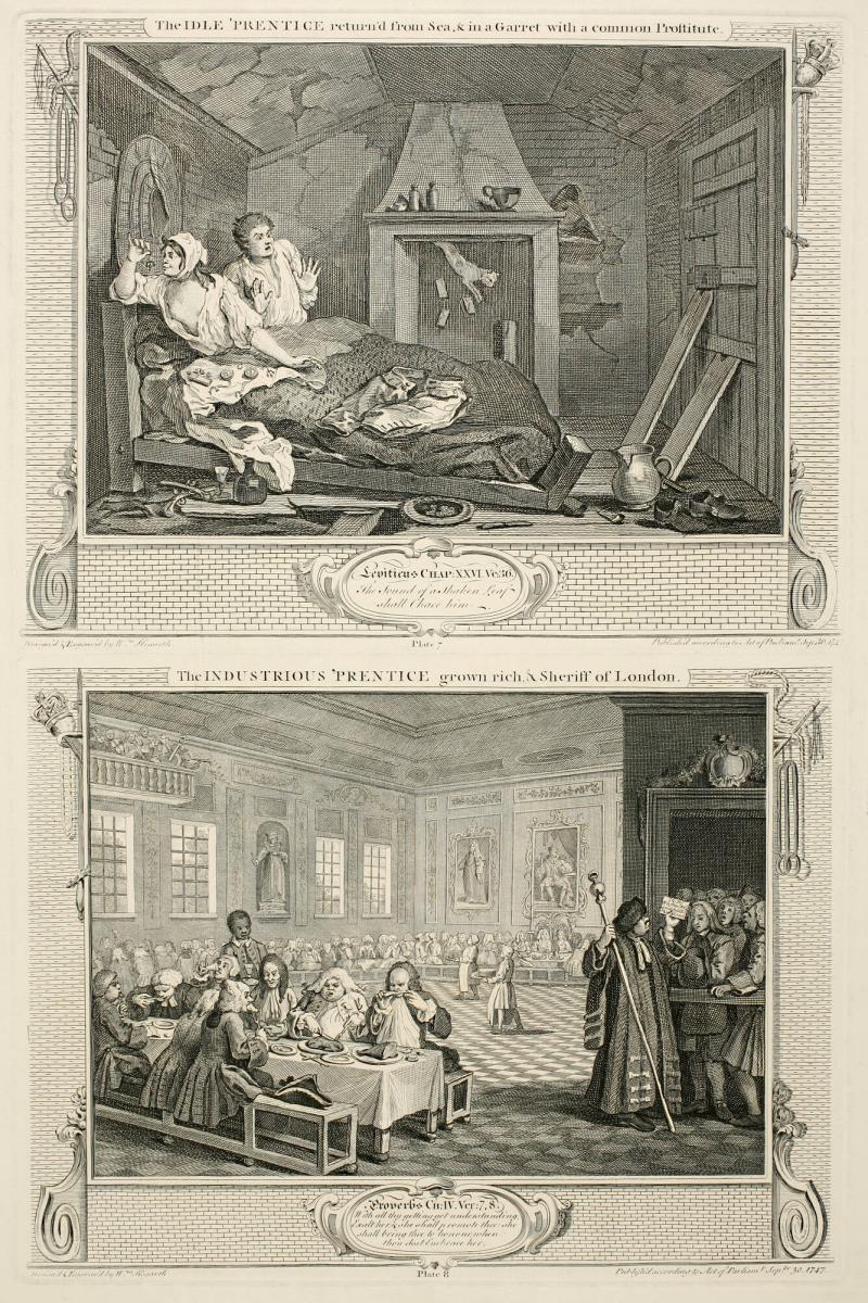 The Idle `Prentice Return'd from Sea and in a Garret with a Common Prostitute, plate 7 from the series Industry and Ildleness; The Industrious `Prentice Grown Rich, and Sheriff of London, plate 8 from the series Industry and Ildleness