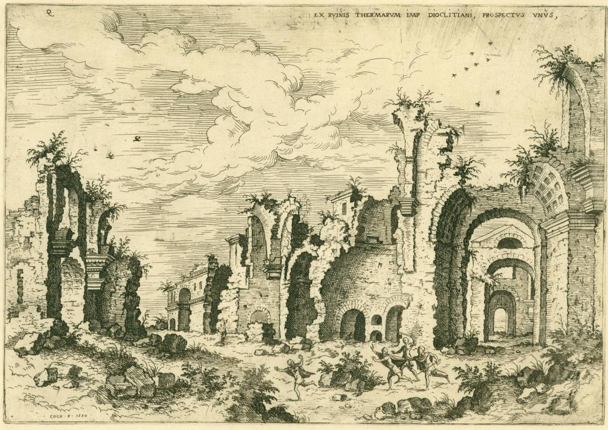 His etchings of the restored elevations of the Baths of Diocletian, such as this one, were unusual at the time for their archaeological accuracy. The Baths of Diocletian, originally built in 306 AD, were the largest public baths in Rome and remained in use until 537 AD before falling into decay.