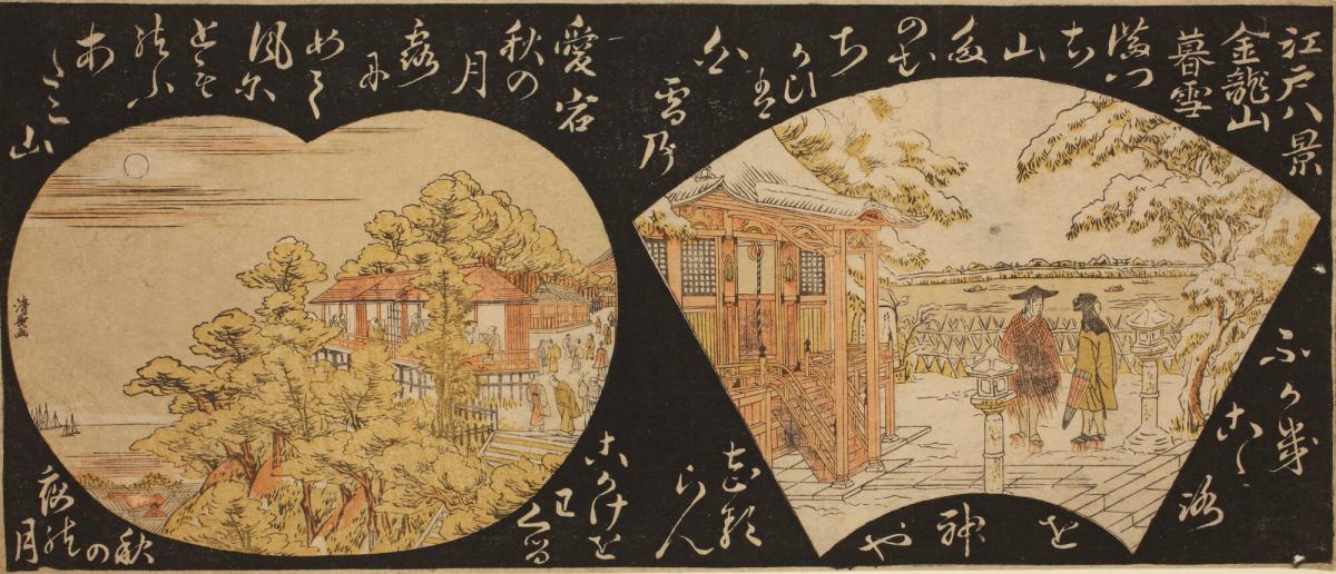 Though created for general audiences, the print incorporates other elements from Chinese elite artistic traditions in addition to the Eight Views theme. The scenes are presented in shapes that resemble Chinese fans, a popular format for paintings. Additionally, the print’s white text against dark backgrounds mimics the appearance of Chinese ink rubbings, a technique where text or images are transferred from stone carvings onto paper.