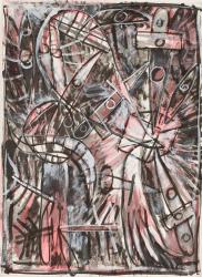 Not on viewAlfonzo fled Cuba in a boat lift in 1980 at age 30, arriving in Miami in search of artistic freedom. His work references art historical lineages of Cubism, Surrealism, and Expressionism, as well as a range of religious symbols. Fragments of smiles and tongues pierced with daggers recur in his work and are derived from Santería—an Afro-Cuban religion that combines Yoruba beliefs and Catholic customs. The chaos and violence in this work also register the suffering that Alfonzo witnessed around him as he made it, three years prior to his own death from AIDS.