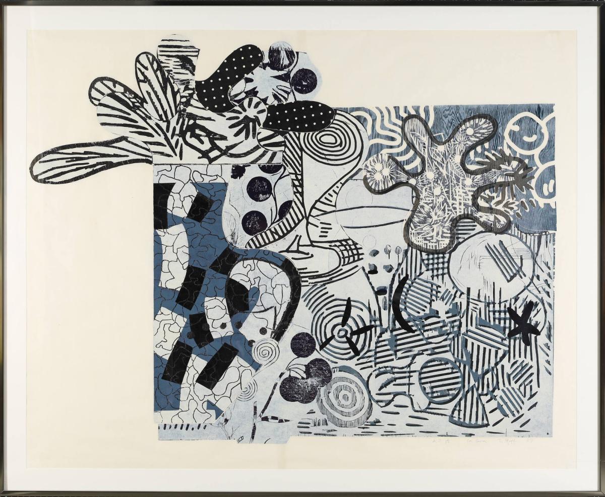 Not on viewPfaff is known for combining disparate materials across painting, sculpture, glassblowing, welding, and carpentry. The title of this print, La Cena , means dinner in Spanish and Italian. Other woodcuts in the same series include references to melons, potatoes, and popcorn. The botanical motifs are typical of Pfaff’s graphic work, as are the references to lattices, which evoke domestic elements such as shutters, gardens, and fences.