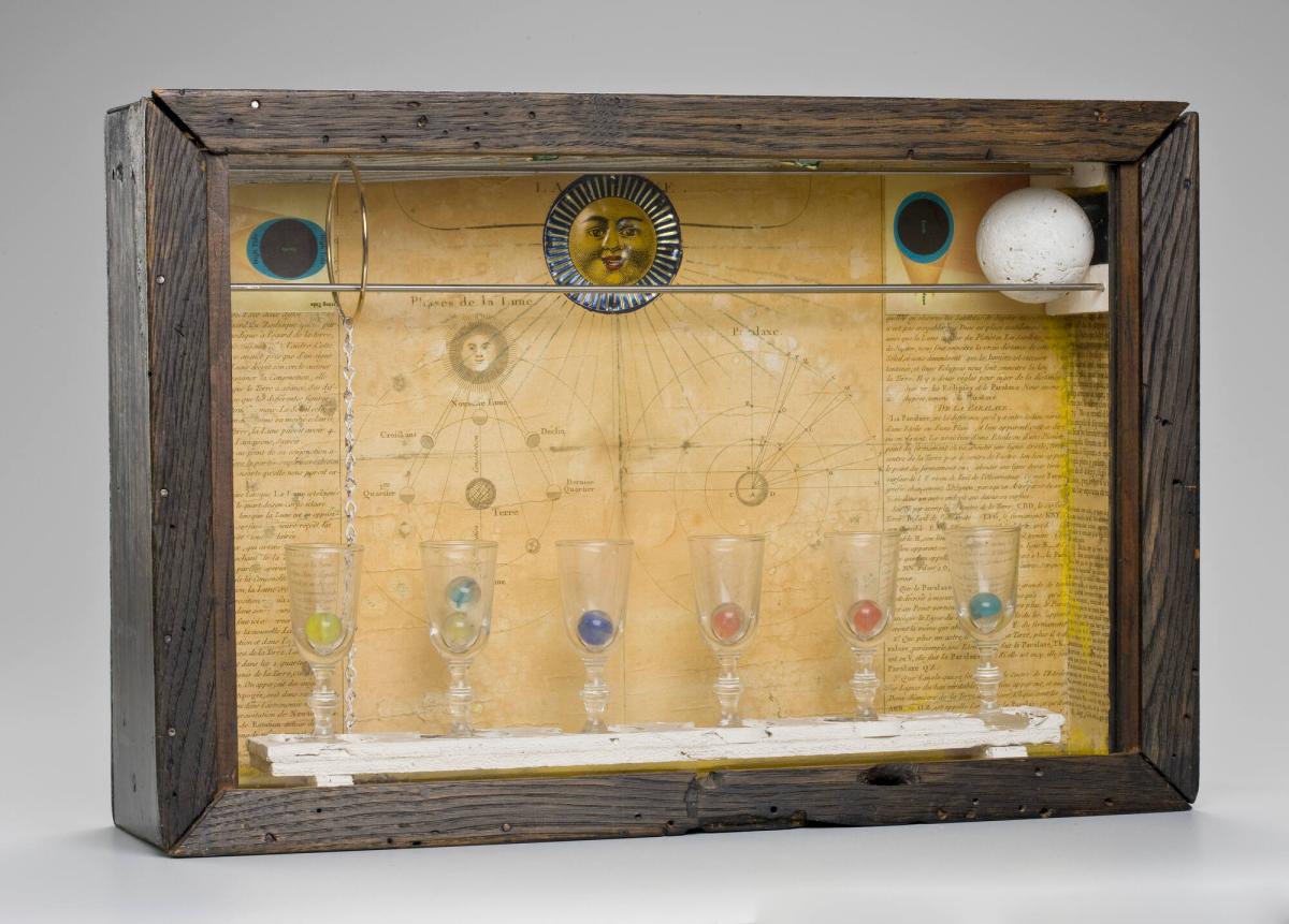 In this work, the box's interior is lined with pages from books: Francis Bacon's De Augmentis Scientiarum (The Advancement of Learning), Spanish legal writings, French astronomical charts, and parts of a German atlas showing the coast of China's Shantung peninsula. Two cutouts from a 1956 Golden Guide to stars that illustrate tide formation provide the earliest possible date for the work. On the back wall is affixed a smiling sun, taken from the lid of an "Il Sole"-brand antipasto can, above a French chart of the phases of the moon with a further smaller, smiling sun. Inside the box is a tray of cordial glasses containing marbles-possibly meant to represent the planets Mercury, Venus, Earth, Mars, Jupiter (with its moons, as there are two marbles in the fifth glass), and Saturn-as well as metal rods, a circle with a chain, and a large white ball. The work is similar to numerous other boxes in which Cornell used small glasses, marbles, larger balls, and astronomical imagery. Although his works seem to always defy description, a text he wrote in 1948 for an exhibition of his work at Copley Galleries, in Beverly Hills, sheds some light on the thought processes involved in the artist's works: