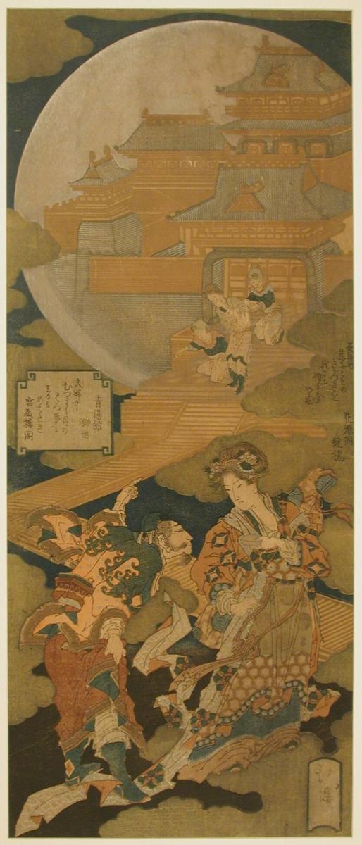 Not on viewThe romance between Tang dynasty Chinese Emperor Minghuang (reigned 713–756) and his favorite concubine, Yang Guifei, is an archetypal love story of East Asia. The emperor’s obsession with the beautiful and charming Yang caused him to neglect his duties, leading to a destructive rebellion that nearly toppled the empire. Here, Totoya Hokkei conflates their romance with a legend in which the emperor, in a dream, visits the palace of the moon goddess. Note the woman in the background who holds a rabbit—people in East Asia see in the patterns on the moon’s surface not a man’s face, but an image of a rabbit using a pestle to make the elixir of immortality. The artist cleverly chose this theme to commemorate 1831 as a Year of the Rabbit.