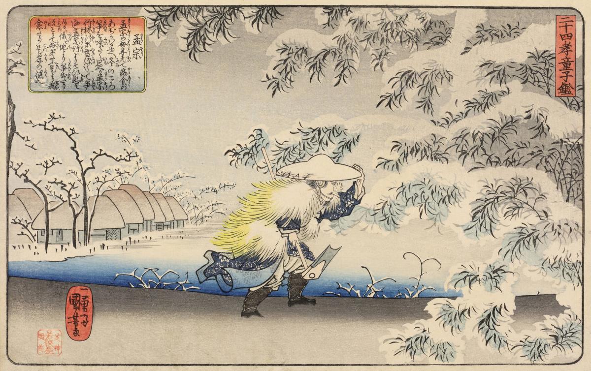 Meng Zong (Mōsō) Searching for Bamboo Shoots in the Snow to Satisfy a Craving of His Mother, from the series A Mirror for Children of the Twenty-four Paragons of Filial Piety