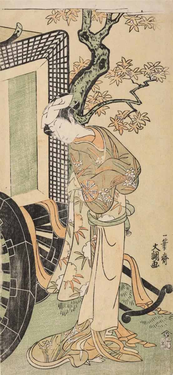The Actor Nakamura Tomijuro I as a Teahouse Waitress Standing beside a Court Carriage