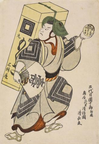 Not on viewThe famous actor Ichikawa Danjuro II is shown in his role as a Japanese folklore hero disguised as a fast-talking salesman in the 1718 play The Medicine Peddler (Uiro Uri), adapted from a traditional tale. He carries a yellow box of moxa (small cones of the powdered herb, mugwort, to be burned on the body for therapy).
