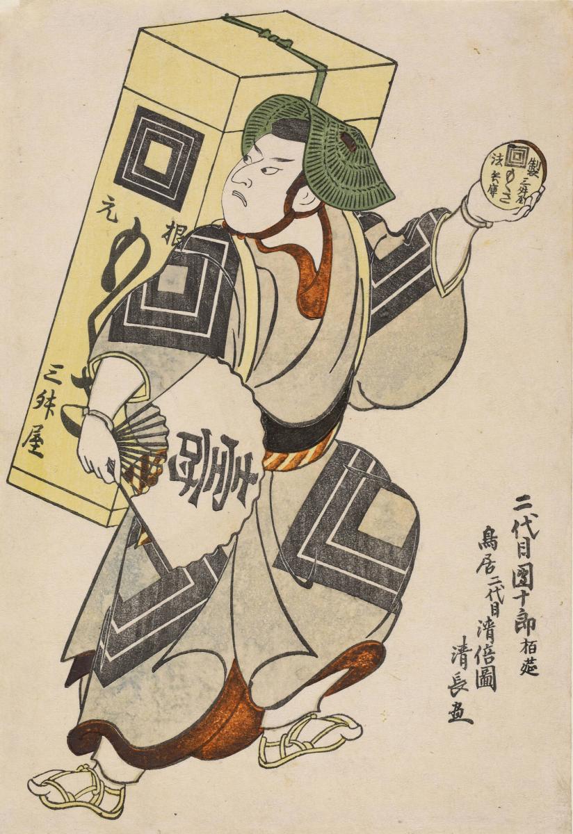 Not on viewThe famous actor Ichikawa Danjuro II is shown in his role as a Japanese folklore hero disguised as a fast-talking salesman in the 1718 play The Medicine Peddler (Uiro Uri), adapted from a traditional tale. He carries a yellow box of moxa (small cones of the powdered herb, mugwort, to be burned on the body for therapy).