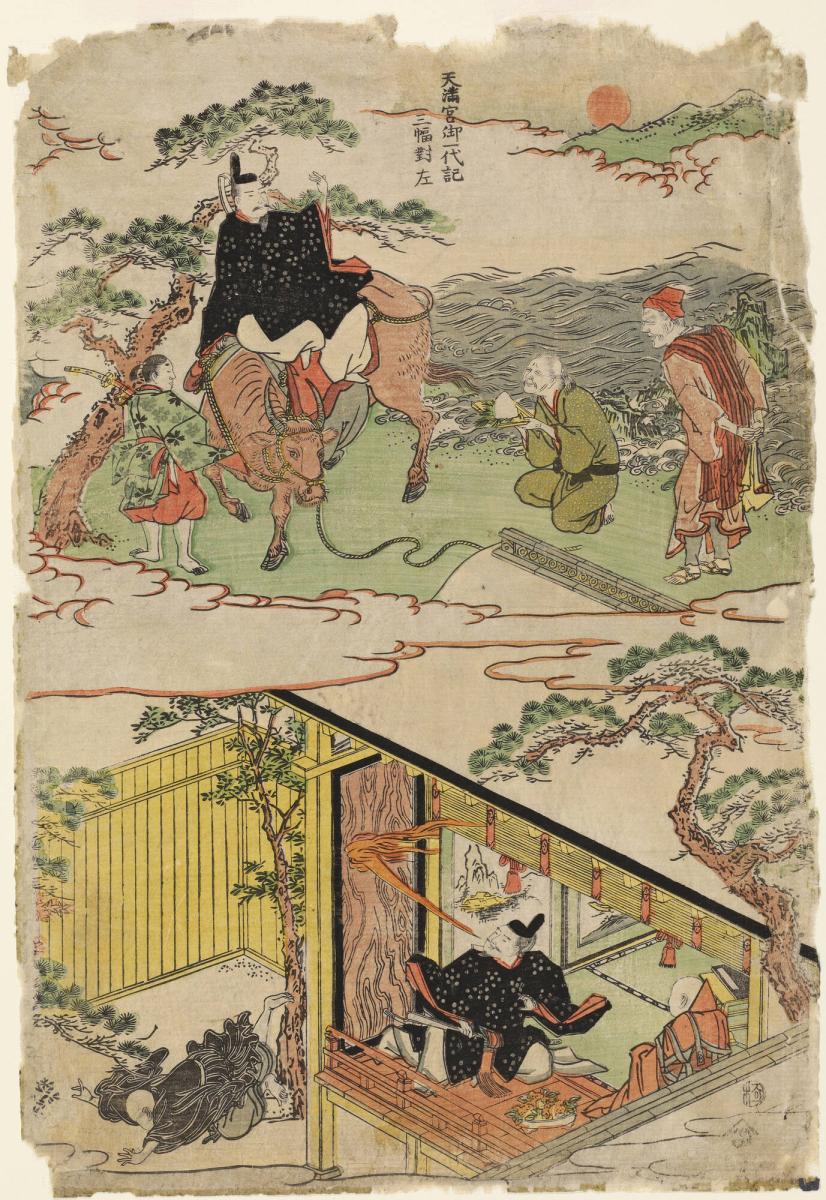 Sugawara Michizane in Exile Breathing Fire and Riding an Ox, from Biography of the Founder of the Temman Shrine