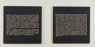 Not on viewConceptual artist Joseph Kosuth was born in Toledo, Ohio, and moved to New York in 1965. He immediately began making works that investigated language and meaning in relation to visual art, most notably through the series Art as Idea, to which this diptych belongs. Kosuth used a method of photographic reproduction to enlarge dictionary definitions to 4-foot squares that hang on the wall like paintings. The series includes definitions for words such as “water,” “art,” “painting,” and even “definition” itself, all in an effort to demonstrate the failure of language to constitute the equivalent of what it purports to describe—the printed definition of water, for example, offers something different than a painting or photograph of water, which still is not the same as the physical experience of water.