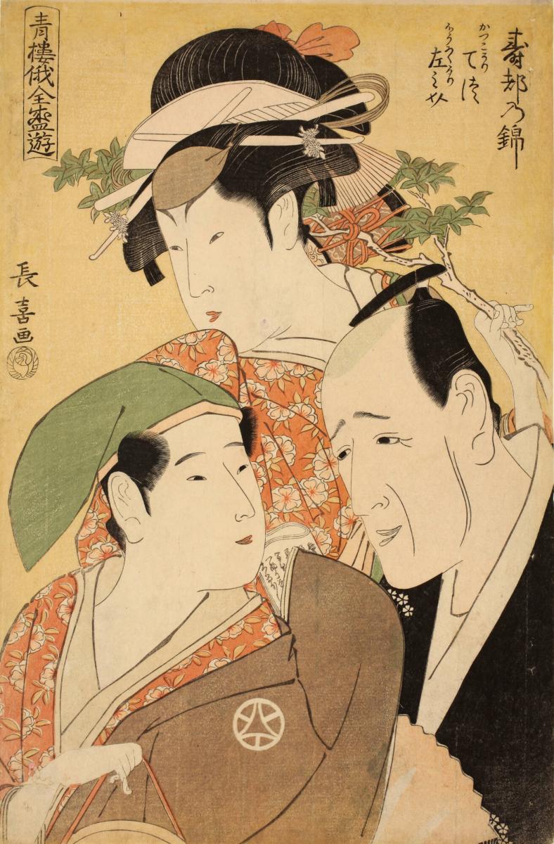 The Chanter Tomimoto Buzendayu and the Geisha Tetsu and Sanosuke as Street Venders of Clay Cooking Pots and Hand Drums in the Dance, from the series Entertainments for the Niwaka Festival in Yoshiwara