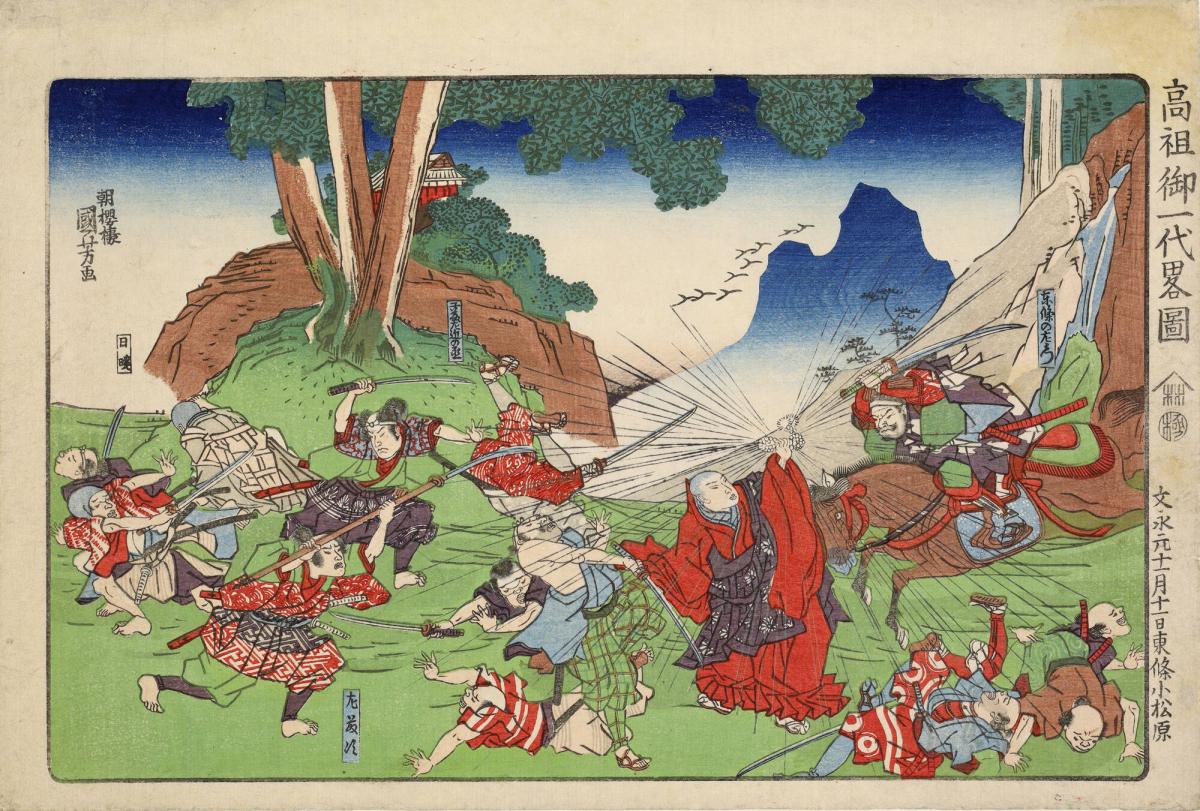 Tojo no Saemon Attacks Nichiren at Komatsubara in 1264, from the series A Short Pictorial Biography of the Founder of the Nichiren Sect