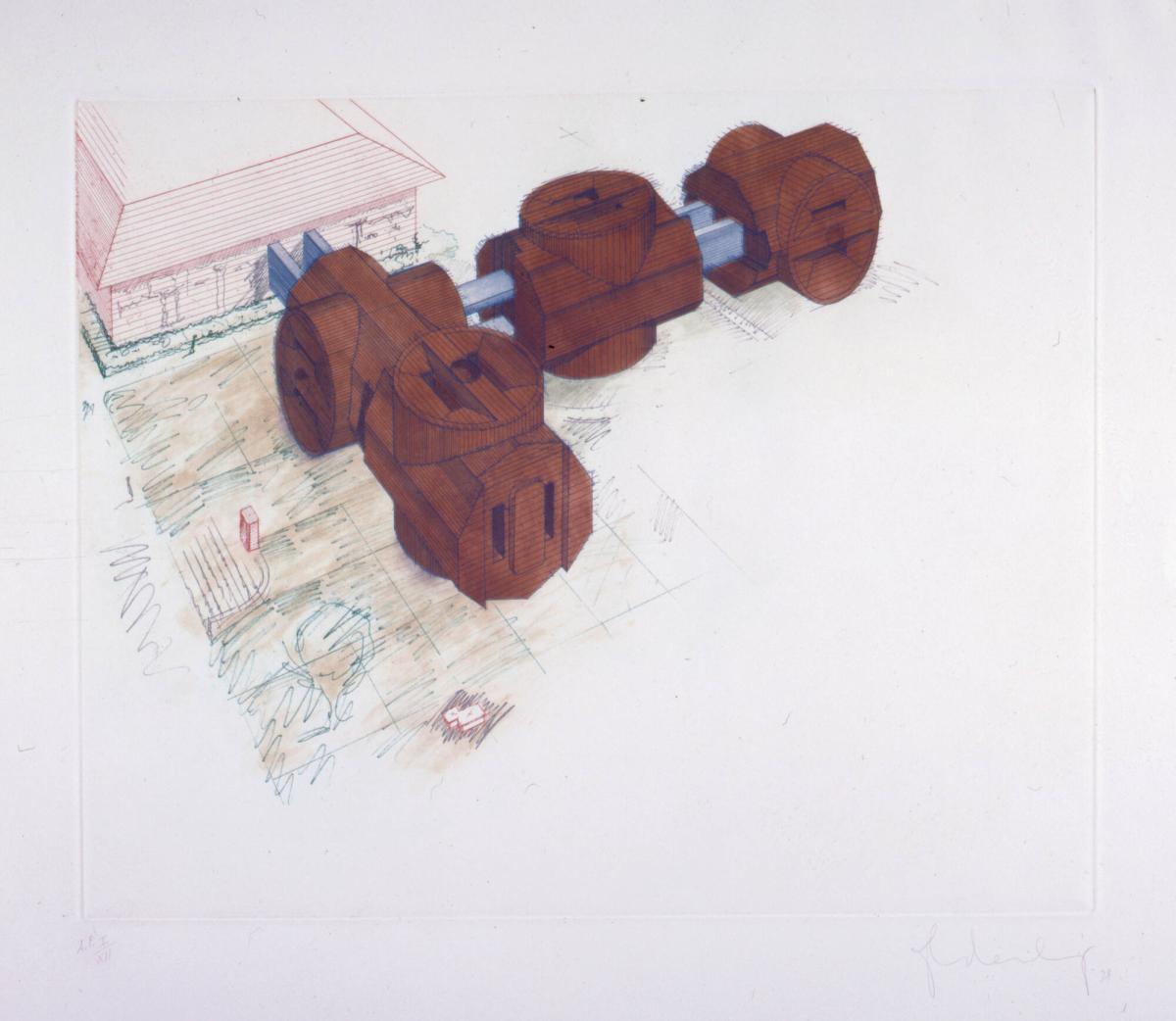 Not on viewClaes Oldenburg’s Giant Three-Way Plug (1970) was the artist’s first commission for a permanent public sculpture. The plug made repeat appearances in Oldenburg’s work, whether as an image rendered in soft watercolors on paper, or as a sculptural object, created at different scales and out of a wide variety of materials, including vinyl, denim, wood, and metal. An electrical plug might at first glance seem less fanciful than the ice cream cones and slices of pie for which Oldenburg is best known, but funneled through his particular vision of the world, in which everyday objects are made strange, wonderful, and sometimes menacing, even an electrical accessory can be playful while also telegraphing energy, power, and danger, as when Oldenburg has depicted the plug floating in bodies of water. In this print, made almost a decade after Oldenburg installed his giant plug at Oberlin, he reimagines it, expanded in scale, multiplied, and literally “plugged” into Cass Gilbert’s 1917 building. In 1977, postmodern architect Robert Venturi had completed an actual extension of the museum consisting of a new gallery for modern and con-temporary art along with an art library and studios, making this “alternate proposal” pure fantasy.