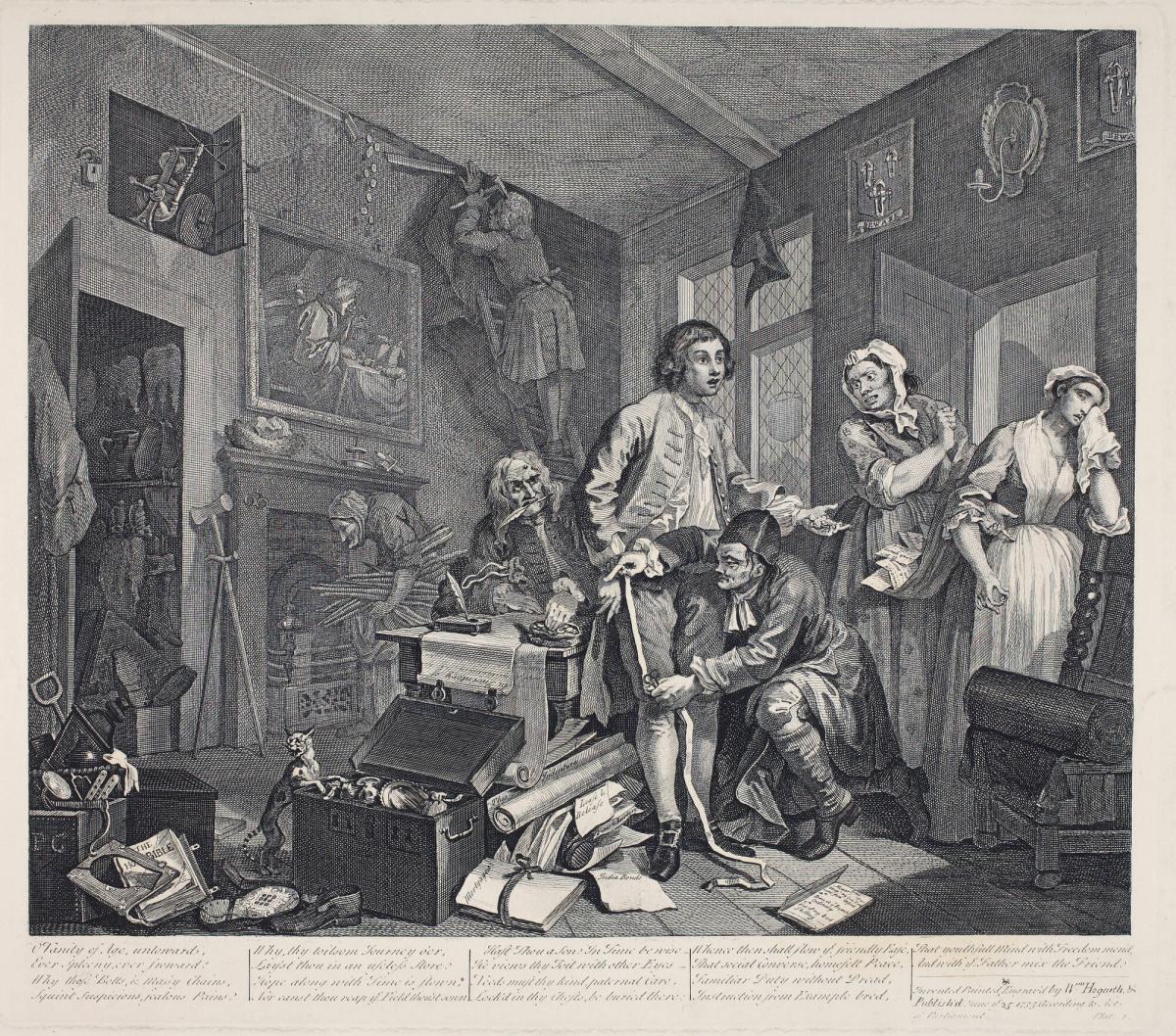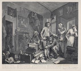 Tom wastes no time in adapting to his new lifestyle. A tailor is fitting him for a new suit, while a decorator is installing new wall hangings in the shabby house. He also rejects his pregnant fiancé, Sarah Young, by attempting to pay her off. Sarah is sobbing into a hankie while holding her engagement ring in her hand, now, a symbol of Tom’s broken promises. Sarah’s mother stands behind her angrily clutching the love letters Tom once wrote to her daughter. Hogarth laces all his prints with clues to help us decode the scene. Sarah pops up throughout these prints representing a more wholesome life that he could have had if he had chosen love and honor over pleasure and vice.