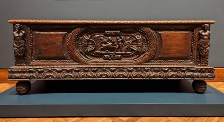 Chest with Carved Medallion Depicting Hercules Fighting Kerberos, and Herms at Front Corners