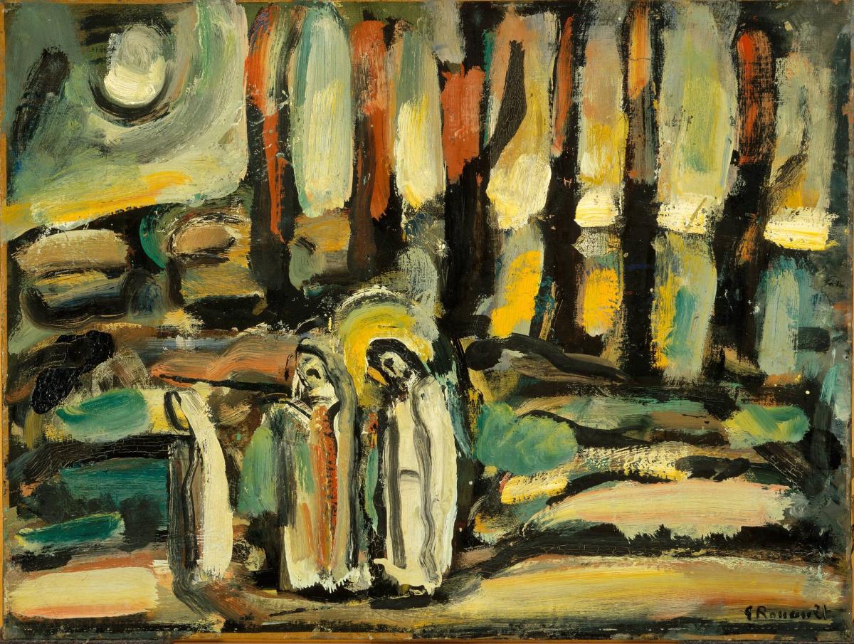 Not on viewEarly in his artistic career, Rouault was drawn to the bright, arbitrary colors of the Fauves, and in the pivotal 1905 Salon d'Automne exhibition in Paris, his paintings were shown with works by Matisse and his followers. But his paintings soon took on a life of their own – in style and technique, and in subject matter. The artist's deep religious convictions resulted in several important works on spiritual and biblical themes. His well-known printing project, entitled Miserere and published in 1927, was composed of a cast of religious and secular characters linked together by familiar phrases and passages from the Bible. Nocturne (Gethsemane) refers to the passage found in three of the Gospels in the New Testament where Christ has gone to the place called Gethsemane to pray with three of his apostles who end up falling asleep.