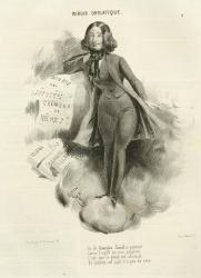 This caricature, or portrait-charge, of feminist writer George Sand (pseudonym of Amandine Aurore Lucie Dupin Dudevant) is typical of strategies used by the press to trivialize her literary accomplishments by focusing attention on her cross-dressing instead of her ideas.<