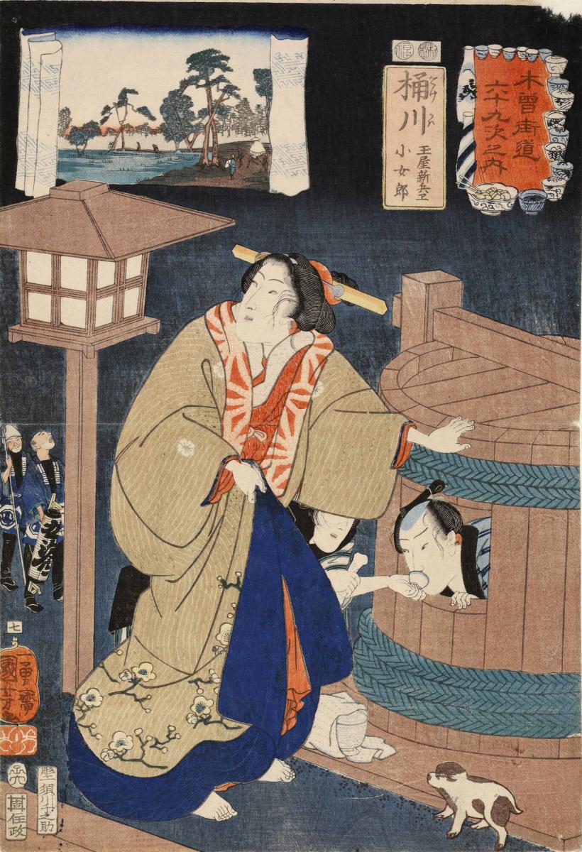Not on viewThe seventh print in this series depicts a popular scene in a book titled The Courtesan’s Melodious Shamisen. In this story, the wealthy merchant Shimbei falls in love with the courtesan, Kojoro, bringing financial ruin and shame upon him and his family. Because he can no longer pay for her services, he is imprisoned in a barrel next to the brothel gate as a warning to other customers. Here, Kojoro and her attendant bring provisions for Shimbei while two watchmen patrol the gates. Bowls of food and drink, like those being delivered, make up the title border and a cloth lines the inset landscape, much like the one in which Shimbei’s provisions are wrapped