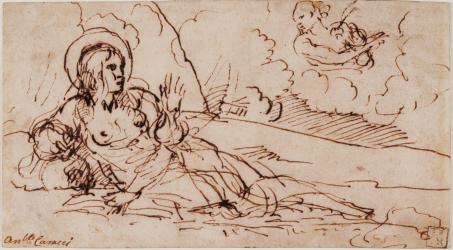 Not on viewThis is a compositional sketch for a painting by Annibale Carracci that is now lost, known through an engraving by Domenico Cunego (1727–1803). The experimental nature of the drawing is especially apparent in the depiction of the saint's left arm, which the artist has drawn variously as raised and across her torso. According to Cunego's print, the finished painting shows that the artist ultimately chose to position the saint's arm in an altogether different pose, with the arm raised and held out, the palm extended upwards horizontally. This sheet, which makes clear the creative process inherent in the act of drawing, once belonged to the English 18th-century history and portrait painter Sir Joshua Reynolds.