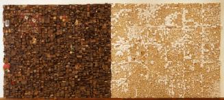 Drew spoke of the use of cotton, which covers half of Untitled, saying that "cotton has a memory. It has a history." Symbolically it relates to the back-breaking labor of slaves on Southern plantations, and here finds a special resonance in its pairing with splintering wooden boxes that contain materials of everyday life, including a metal toaster and toys, some stained with rust. He has stated that "the weight of my ancestry still continues in my work" and attributes his use of small boxes to a visit he made in 1992 to the claustrophobia-inducing small holding-quarters for slaves being sent to America, in Dakar, Senegal. Drew intentionally ages-whether with sunlight, water, shredding, or other manipulations-many of the objects he uses. The two gridded sections here together evoke the dichotomy of North and South, of urban and rural. Of similar works, Drew said in 2000, "The grid is my basis of sanity. Otherwise it would just be noise. I mean, these things are loud, but if you know what to listen for, they'll speak to you."