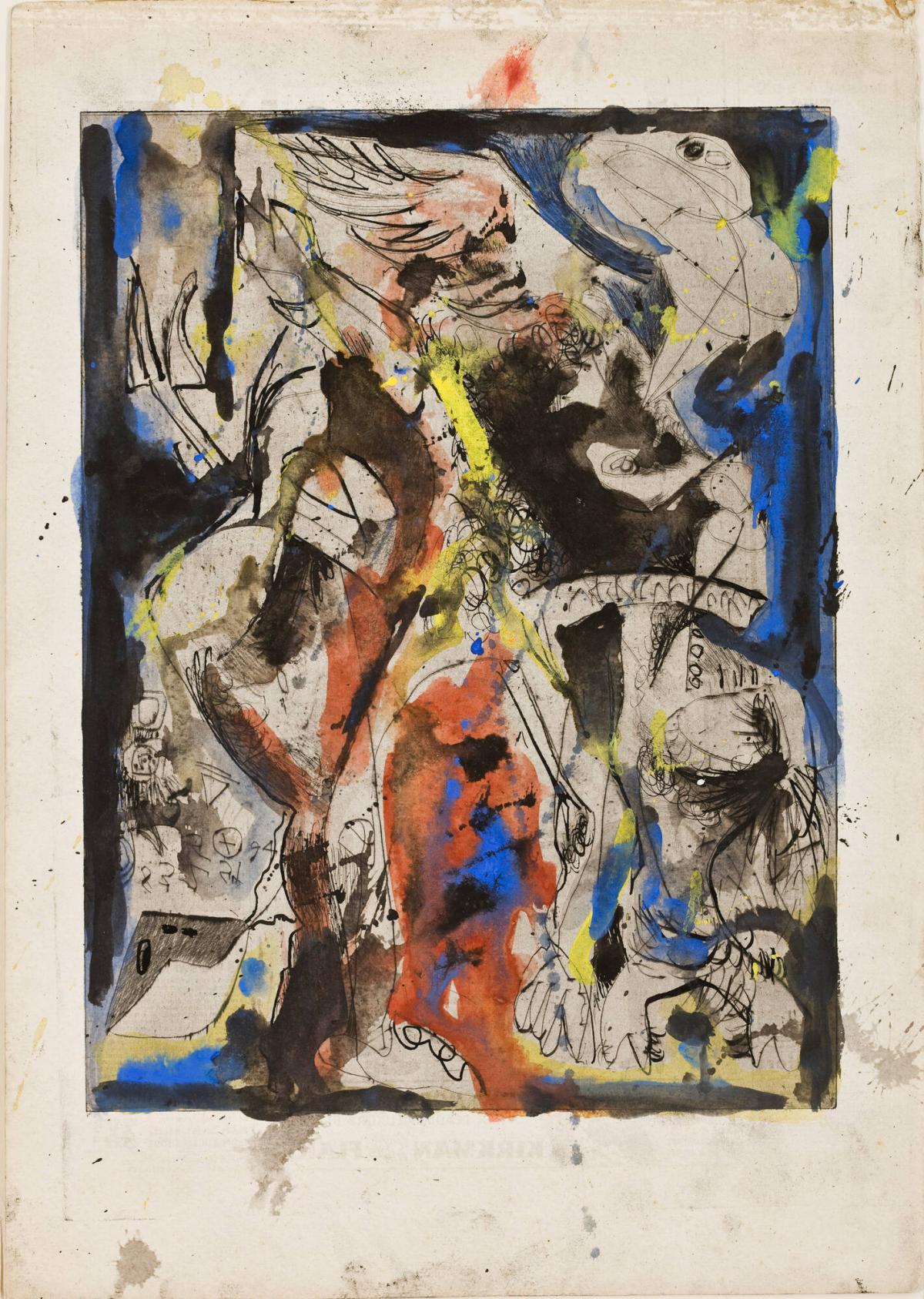 Not on viewThis drawing-over-print has all the hallmarks of the spontaneous, gestural qualities-and unconventional materials-for which Jackson Pollock is known. His work in the early and mid-1940s often took up Surrealist imagery. This is especially apparent in the print underlying the drawing in this work, on which forms resembling a fish or lobster, eyes, a leg and arm, and a wing are visible. During 1944-45, Pollock experimented with engraving, working under British artist Stanley William Hayter (1901-1988), and this sheet contains two of the proofs they pulled at that time.