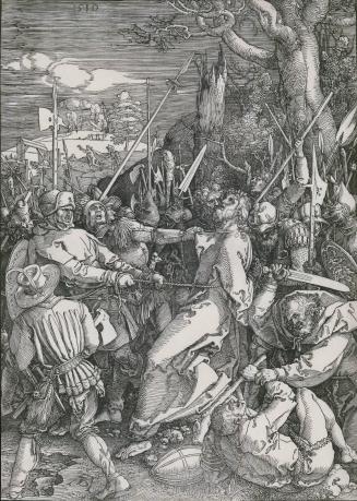 Not on viewJudas Iscariot’s betrayal of Christ occurred at the Garden of Gethsemane, to which Jesus had gone to pray after the Last Supper. It was here that the disciple Judas, via his infamous kiss, identified Christ to the group of soldiers that accompanied him. Dürer portrays the moment immediately following this kiss, as Judas withdraws from Jesus' side. The figure of Jesus occupies the center of this composition, where he is shown tethered by ropes around his waist. Christ's calm gaze contrasts sharply with the frenzy of the mass surrounding him, which Dürer amplifies through the varied slants of the crowd's protruding weapons. This passionate image is one of the large-format woodcuts belonging to Dürer's Large Passion cycle, published as a book in 1511.