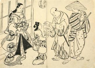 On viewThis print represents Masanobu’s love for clever literary allusions or references to legends cast in contemporary settings, a tradition that came to be known as parody pictures, or mitate-e 見立絵. This composition makes a reference to chapter four of the classic Japanese novel, The Tale of Genji, titled Yūgao, or Evening Faces. The novel’s main character, the prince Genji, spots some beautiful flowers at the hedge fence of a house he is passing. When he orders his attendant to gather some of the flowers, a young girl appears from the house. She gives the attendant a folding fan on which to place the blossoms before offering them to Genji, turning it into a tasteful, impromptu gift from the mysterious lady of the house, with whom Genji soon has an affair. Masanobu transformed the literary episode into a contemporary scene, set in the Yoshiwara pleasure quarter of Edo. Here a young girl representing the courtesan in the background presents flowers on a fan to a customer.