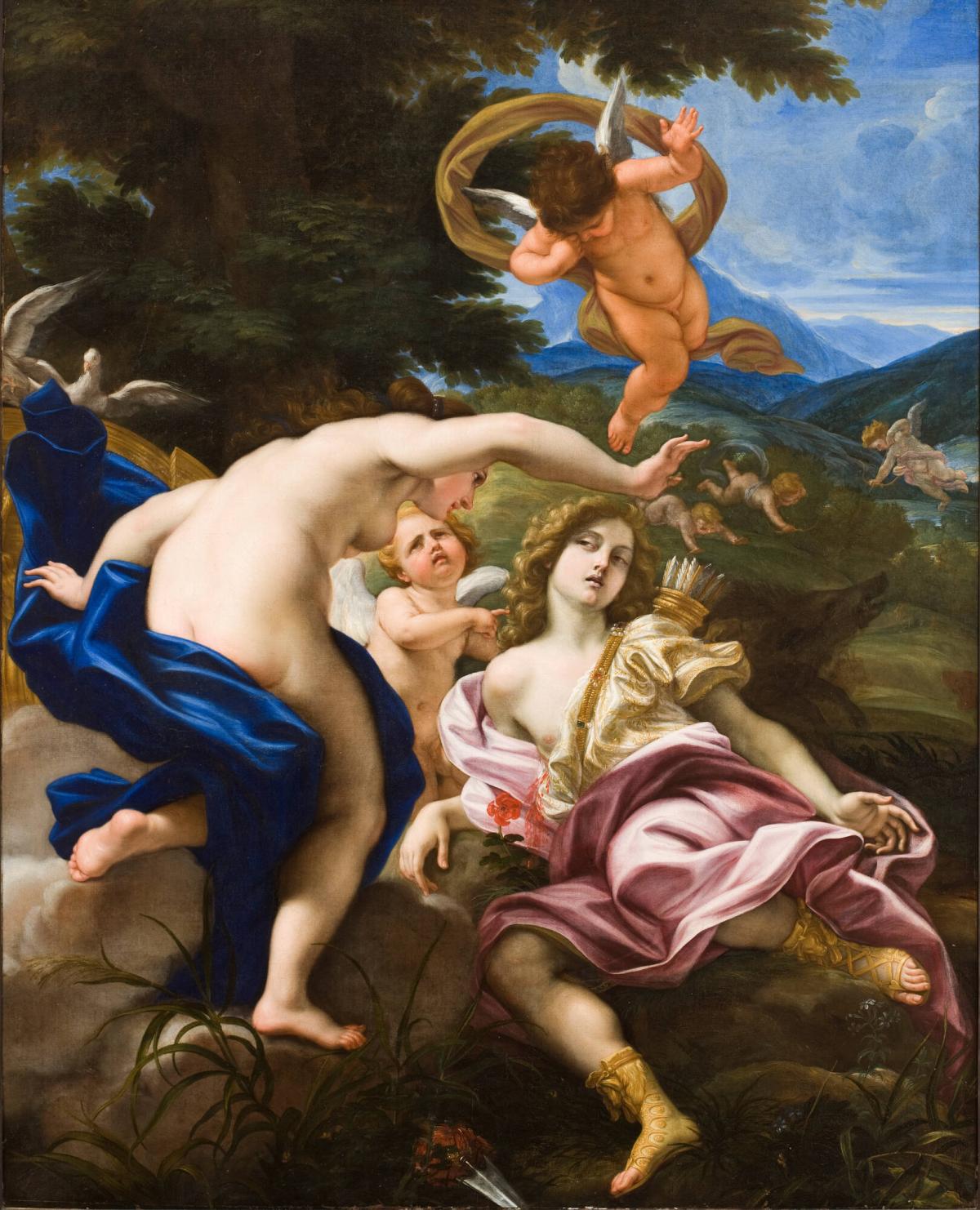 The AMAM painting is a tour-de-force of composition, draftsmanship, and coloration. Adonis, warned by his lover Venus of the dangers of the hunt, has just been gored by the boar, seen over his shoulder. Bright red blood drips onto the ground from his wound, where an anemone springs up in the same hue; his arrows are unused over his shoulder, and his spear lies at his feet. The central putto points toward Adonis with anguished tears, while the one hovering above wipes his eye. In the background, other putti draw their bows to shoot the boar as dogs hold him at bay. Most dramatically, Venus has just arrived, in the very act of jumping from her chariot to the ground (her accompanying doves are all aflutter), in a marvelously twisting pose inspired by the sculptures of Gianlorenzo Bernini. With concern she hovers over her lover, arm outstretched, realizing already from his pallor-the blood has drained completely from his face and gray lips- that all hope is lost.