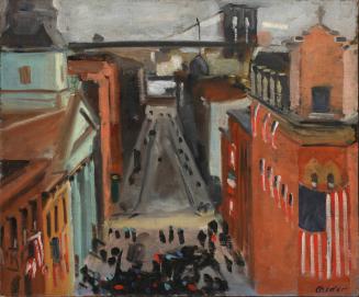 Not on viewCalder's early paintings explore the energy and gritty realism of contemporary urban life. Here his choice of an aerial view heightens the impact of the densely packed urbanscape. The Brooklyn Bridge was a marvel of aesthetics and engineering: At the time of its completion in 1883, it was the longest suspension bridge in the world, with stone towers taller than almost every building in New York City. The bridge came to symbolize the modernity of the American city.