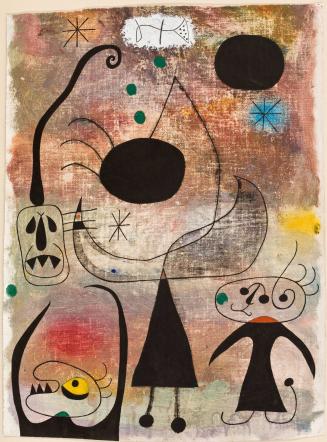 Miró's dreamlike painting shows the rhythmic figures, birds, suns, stars, and other elements that characterized his creative output in the 1940s and '50s. It is reminiscent of his Constellations series of small gouaches on paper, created during 1940-41, in which he created biomorphic and astronomical forms.