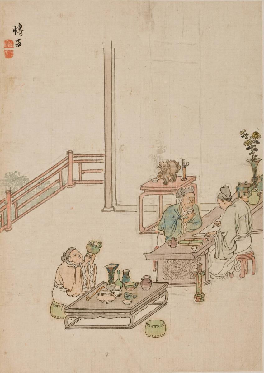 Three refined gentlemen sit at tables covered with bronze and ceramic antiquities. Smoke rises from a lion-shaped incense burner on a table in the background; chrysanthemums emerge from an ancient bronze goblet. One man drinks a small cup of wine while another examines a scroll. Another man holds a bronze vessel aloft to inspect the bottom.