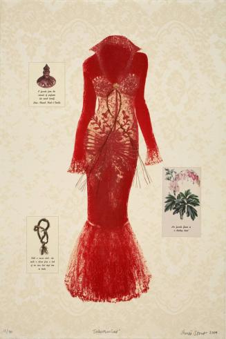 Not on viewBest known for her sculptural assemblages, Renée Stout often evokes the culture of Africa and the Americas in her work. In Seduction Coat, the artist deviates from her typical three-dimensional practice to create a mixed-media print. Inspired by Erzulie, the Haitian Vodou deity of love and beauty, the work depicts a red garment surrounded by references to seduction and desire. The bottle of perfume represents the fragrances left as offerings by devotees of Erzulie. The goddess’s role as protector of women who have been betrayed by their romantic partners is suggested by the “bleeding heart” flowers. A cowrie shell and strand of human hair are elements of a love spell.