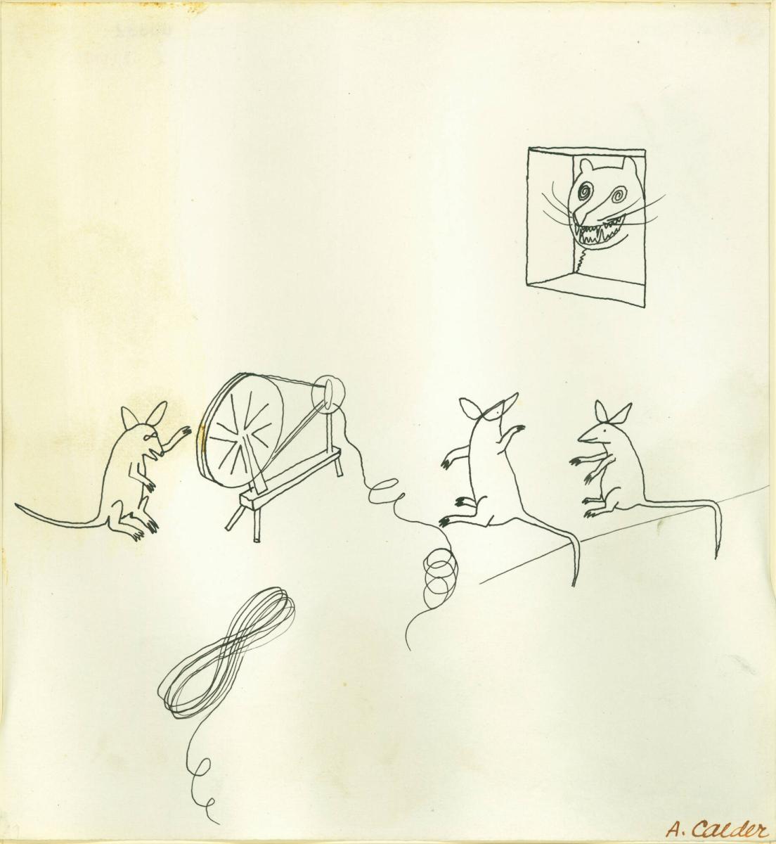 Not on viewAlexander Calder made a series of 85 drawings to illustrate Three Young Rats and Other Rhymes, a whimsical book of anonymous nursery-rhymes edited by James Johnson Sweeney and published by the dealer Curt Valentin in 1944. The artist’s playful and sometimes humorous interpretations of the rhymes are rendered in a simplified and continuous linear style. These compositions recall Calder’s imaginative wire sculptures, impressively formed out of single pieces of thin wire to resemble line drawings in three-dimensional space.
