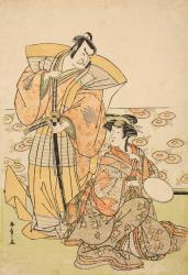 Not on viewThe actor Nakamura Nakazō I (1736–90), in a role as a samurai, looms over the seated Nakamura Rikō (1742–86), acting in a female role and holding a hand mirror. The play is thought to be Chigo Torii Tobiiri Kitsune, performed at the Ichimura theater during the eleventh month of 1777.