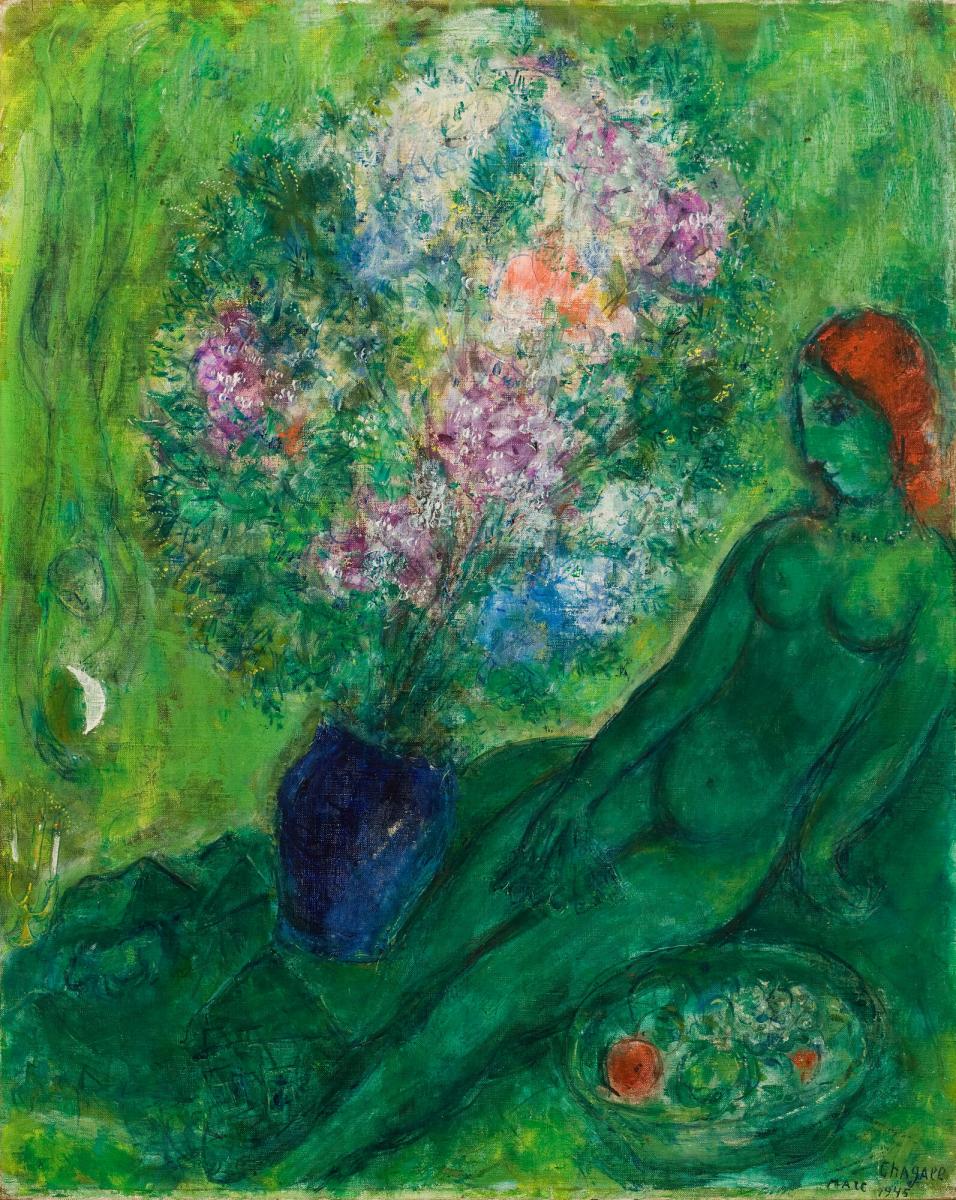 Not on viewIn this work the figure of a female nude—the artist’s companion Virginia Haggard McNeil—merges with the deep green hill on which she reclines, surrounded by fruit and flowers, symbols of fertility. Marc Chagall painted this scene in the wake of several traumas, including the death of his beloved wife Bella in 1944, and the horrors of World War II. A Russian Jew who had been working in Paris among notable artistic contemporaries such as Amedeo Modigliani and Fernand Léger, Chagall fled to the United States in 1941 to escape Nazi persecution.
