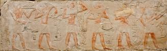 Provenance(Dr. Jacob Hirsch [1874-1955], Lucerne, Switzerland); purchased 1943 by Allen Memorial Art Museum, Oberlin, OHAbove the six processional figures is a row of hieroglyphics indicating the gifts; only a small portion of the right-most text is visible, translated as "wooden," and may refer to a club or musical instrument, such as is shown in the right-most figure's hands. Further hieroglyphics, from left to right, have been deciphered as: "He lives from His Majesty['s Grace]"; "The royal scribe of the palace documents, brother of eternity"; "The prince of .!.!."; "The prince of [location]"; "The prince of [?] coming to his life/nourishment"; and "He was a prince of peace."