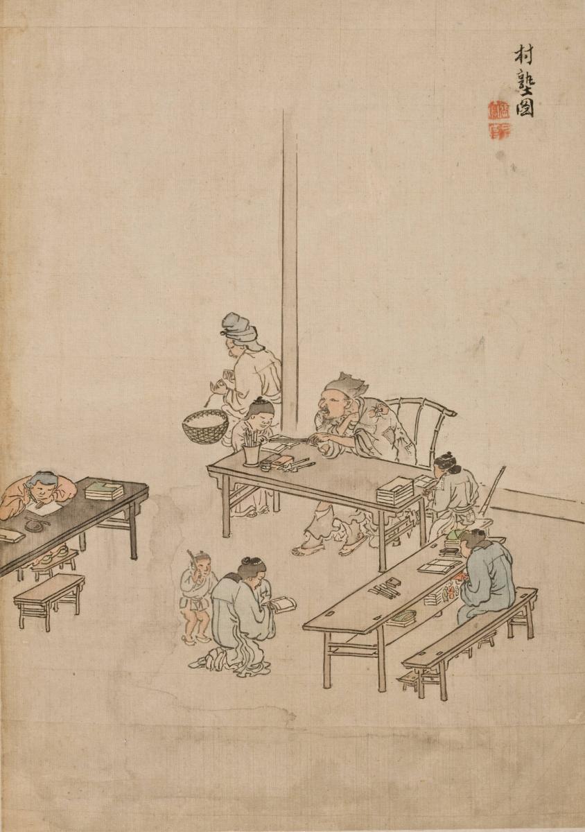 In Zhāng Hóng’s humorous take on a humble village schoolroom, a shabbily dressed teacher points to a line in a book, helping one student follow the text. Another boy reads the text aloud, kneeling on the ground as punishment for some misdeed. Next to him a smaller, pantsless boy stands ready with a stick to penalize any reading mistakes. Another boy, at the right in a blue robe, is secretly looking at another book, and has toys hidden behind books on the shelf under his desk. A woman sits just outside the schoolroom counting on her fingers, an empty basket next to her, suggesting that she has just sold her goods at the village market.