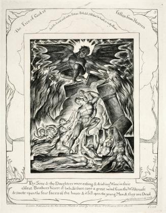 Not on viewPainter, poet and engraver, William Blake was an eccentric visionary and ardent nonconformist known for his mystical themes and innovative forms. His agile and elongated figures, influenced by Gothic sculpture and Michelangelo, are often pictured floating in a non-material world, adorned with symbols from his complex personal mythology. Blake's Book of Job integrates image and design with biblical texts that reconstruct the Old Testament in New Testament terms. The Job narrative, in which Satan tortures the upright Everyman in a test of faith, mirrors Blake's own artistic vision. Blake was deeply opposed to academic art, and in his interpretation of the tale Job is transformed from despair to redemption through a spiritual belief in the power of individual imagination.