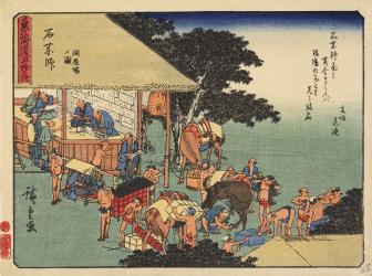 Accounting House at Ishiyakushi, with a Poem by Tomogaki Matsura, no. 45 from the series The Fifty-three Stations of the Tōkaidō