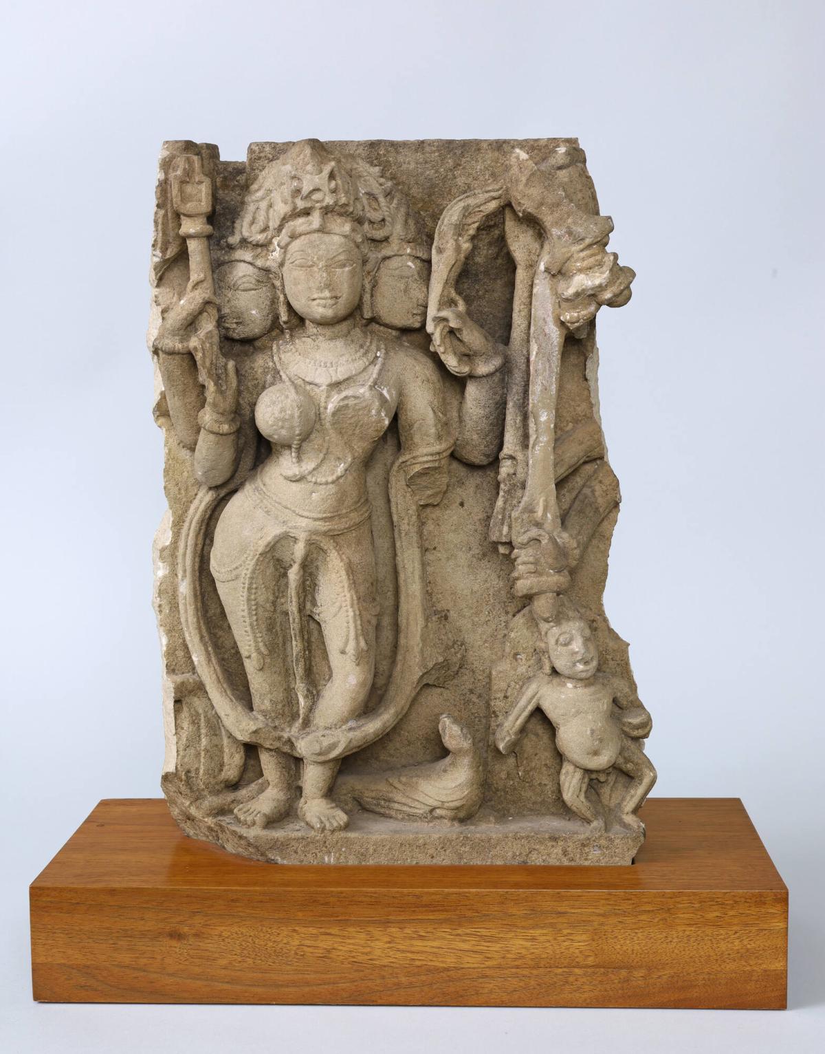 On viewBrahmi, or Brahmani, is a form of Devī (The Goddess) understood to be the shakti, or dynamic power, of Brahmā, the god of creation. Like Brahmā she has four faces (the one to the rear is not visible) symbolizing universal knowledge, and four arms that represent universal power. Her two forward arms once formed the symbolic gestures (mudrā) of fearlessness (right, palm forward fingers up) and generosity (left, palm forward, fingers down). Her upper arms hold attributes of Brahmā, the upper right a ladle (sruk) used in offerings and the upper left a brush of kusa grass, both of which refer to sacrifice. Below her is the vehicle of Brahmā and Brahmi, the haṃsa, often translated as swan or goose.