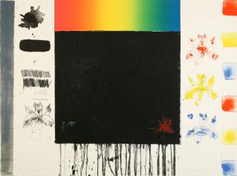 Not on viewAlthough better known today for her captivating Waterfall paintings, Pat Steir began her artistic career by studying printmaking at the Pratt Institute in New York City. Steir’s Roll Me a Rainbow visualizes the process for producing a lithograph. On the left side of the print, Steir included a series of marks using tusche ink wash and a lithographic crayon, the materials an artist would employ to create a design on the surface of a printing stone. On the right side, Steir added strokes of red, yellow, and blue ink to fill in the outlines of her flowers and squares. At the center, she made a large square using broad strokes of tusche ink wash, which she subsequently ruled with vertical lines. The square terminates in a fringe of dripping pigment along its bottom edge, an element that resembles her later Waterfall paintings. The title of this print refers to the instructions Steir received from her printer at Landfall Press, whose request to “roll me a rainbow” resulted in the artist’s addition of a color scale at the top of her image.