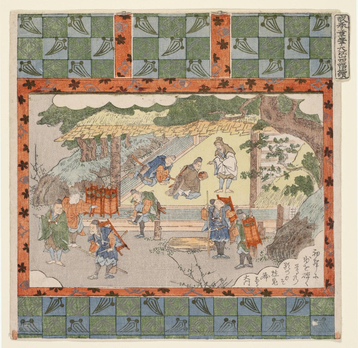 Raiko and His Retainers Disguise Themselves as Priests and Set Off for Oe Mountain, from the series Four Paintings of the Journey to Mt. Oe by the Late Shunsho