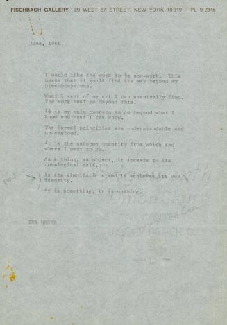Artist statement for the exhibition "Eva Hesse: Chain Polymers" at the Fischbach Gallery, New York, NY, November 15-December 5, 1968