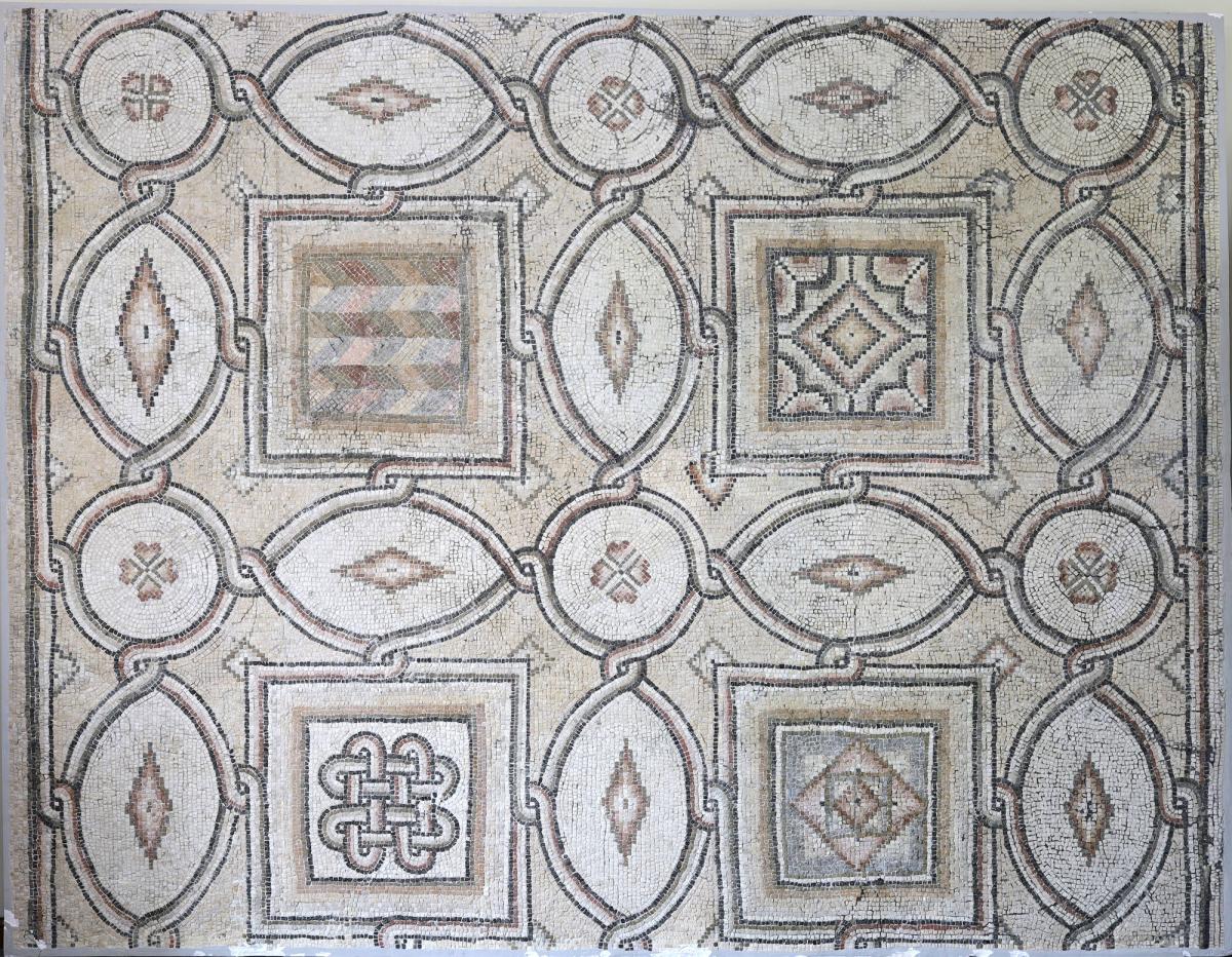 A Section of Early Christian Mosaic Pavement from the Upper Level of the House of Aion in Hatay, Southern Turkey (Antioch), Containing Geometric Patterns: Rainbow, Interlace, Diamond Motifs