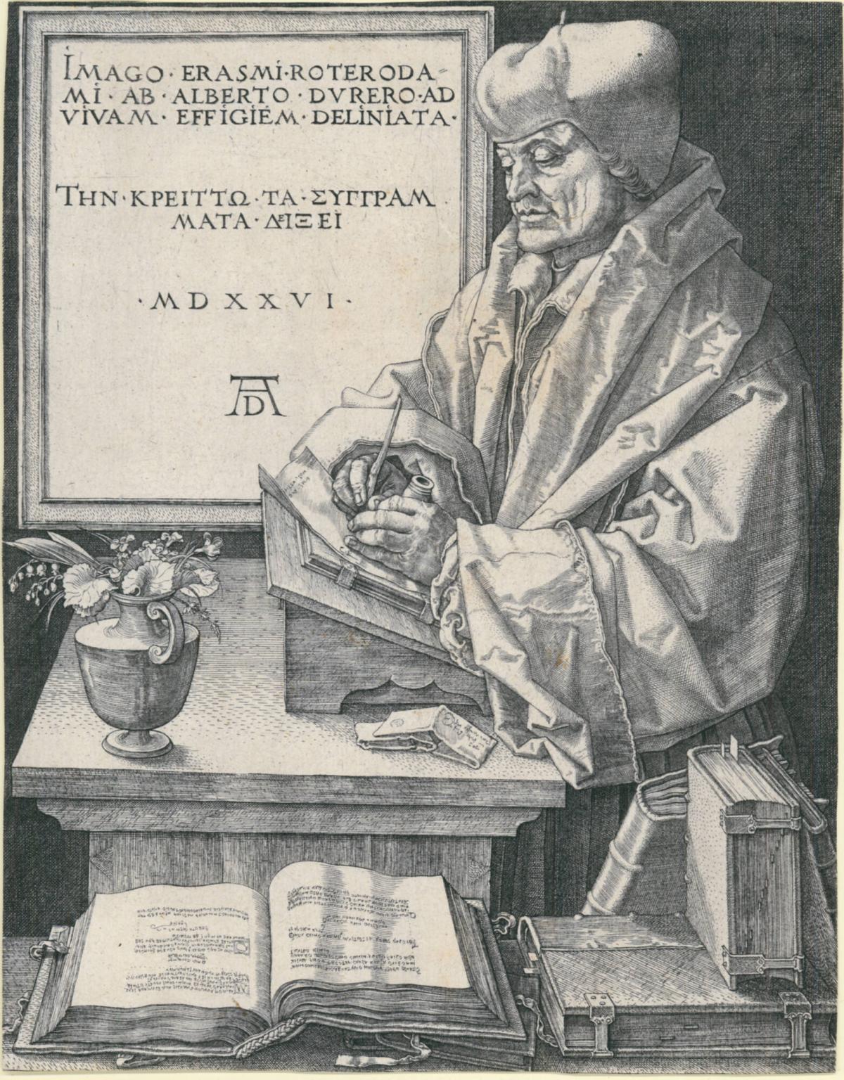 Not on viewIn this final engraving of his artistic career, Albrecht Dürer portrays scholar Desiderius Erasmus (1465-1536). Erasmus had urged Dürer to complete this portrait after meeting the artist in the Netherlands in 1520-21, but was ultimately disappointed with the result, which he considered an inadequate likeness. Dürer may have felt similarly, as the inscription at the top right of the print reads, "Portrait of Erasmus of Rotterdam, drawn from the living model by Albrecht Dürer. His writings portray him better." Whether or not Dürer's portrait adequately describes Erasmus' physical appearance, it certainly emphasizes his intellectual pursuits, via the Greek and Latin inscription, the books surrounding the figure, and the writing implements in Erasmus' hand. Shown in the act of writing a letter, Erasmus in this portrait has been likened by some art historians to representations of the famed letter-writer Saint Jerome, who Renaissance humanists (including Erasmus) revered as a paragon of erudition.