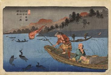 Kōdo: Cormorant Fishing Boats on the Nagae River, no. 55 from the series The Stations of the Kiso Road