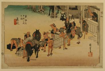 Changing Porters and Horses at Fujieda, no. 23 from the series Fifty-three Stations of the Tōkaidō