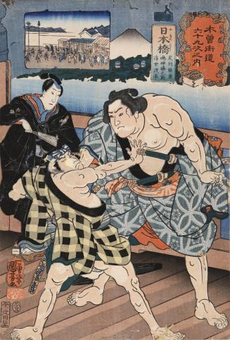 Nihonbashi: Ashikaga Yorikane, Narukami Katsunosuke and Ukiyo Watahei on Nihon Bridge, no. 1 from the series The Sixty-nine Stations of the Kisokaidō