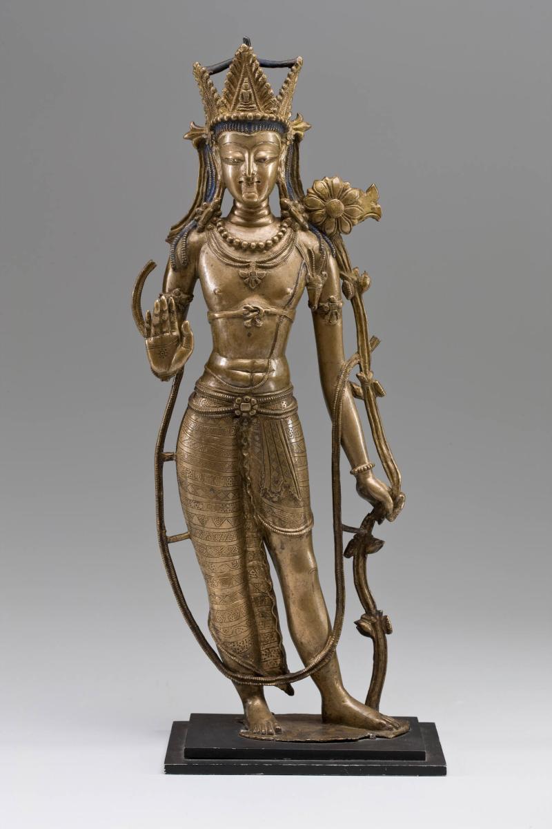 Padmapāṇi means “lotus holder,” and was another name for Avalokiteśvara, the bodhisattva who represents the vast compassion of all of the buddhas. Here, Padmapāṇi holds the stem of a lotus in their proper left hand, and the blossom rests by their left shoulder. Because the lotus is a beautiful flower that rises on a long stem out of muddy ponds, it became a symbol of purity in South Asian religions. In Buddhism the lotus represents the enlightened mind that rises above the ignorance, attachment, and aversion that keep us tied to our world of suffering (Saṃsāra).