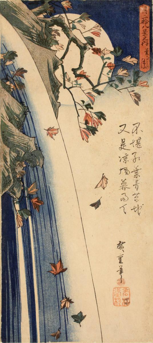 Not on viewA cliffside tree reaches across the face of a full moon. Autumn maple leaves fall, their slow downward drift contrasting with the plunging waterfall. Both are amplified by the long vertical format of the print. In the space at the right is a poem from Wakan rōeishū, a classical anthology of Japanese and Chinese poems from the eleventh century that would have been familiar to the highly literate Edo populace.
